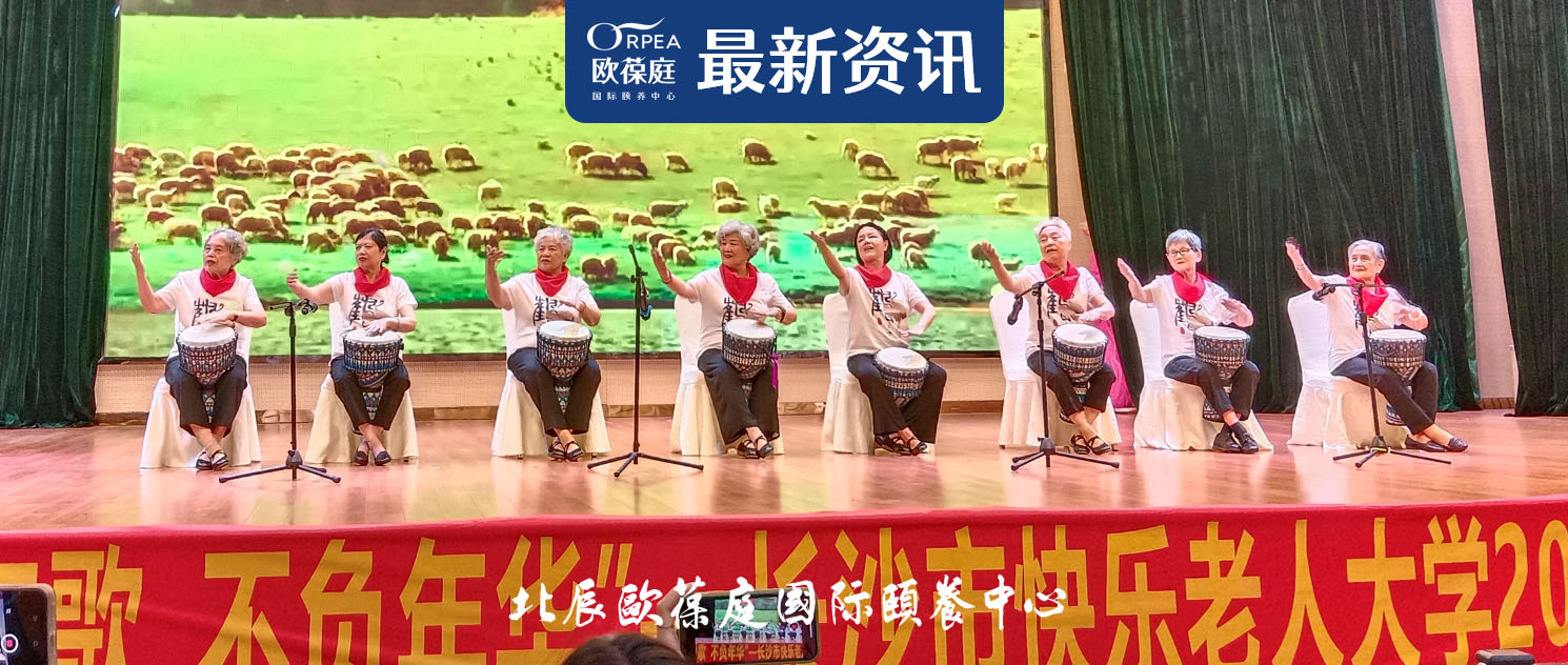 八位银发女性组成的“时尚奶奶团”身穿时尚T恤,激情洋溢地齐声演奏非洲鼓表演《我站在草原望北京》,惊艳亮相湖南一老年大学结业汇演舞台。她们来自高端法式养老中心——北辰欧葆庭国际颐养中心,其中年龄最大的94岁,最小的77岁,平均年龄80多岁。