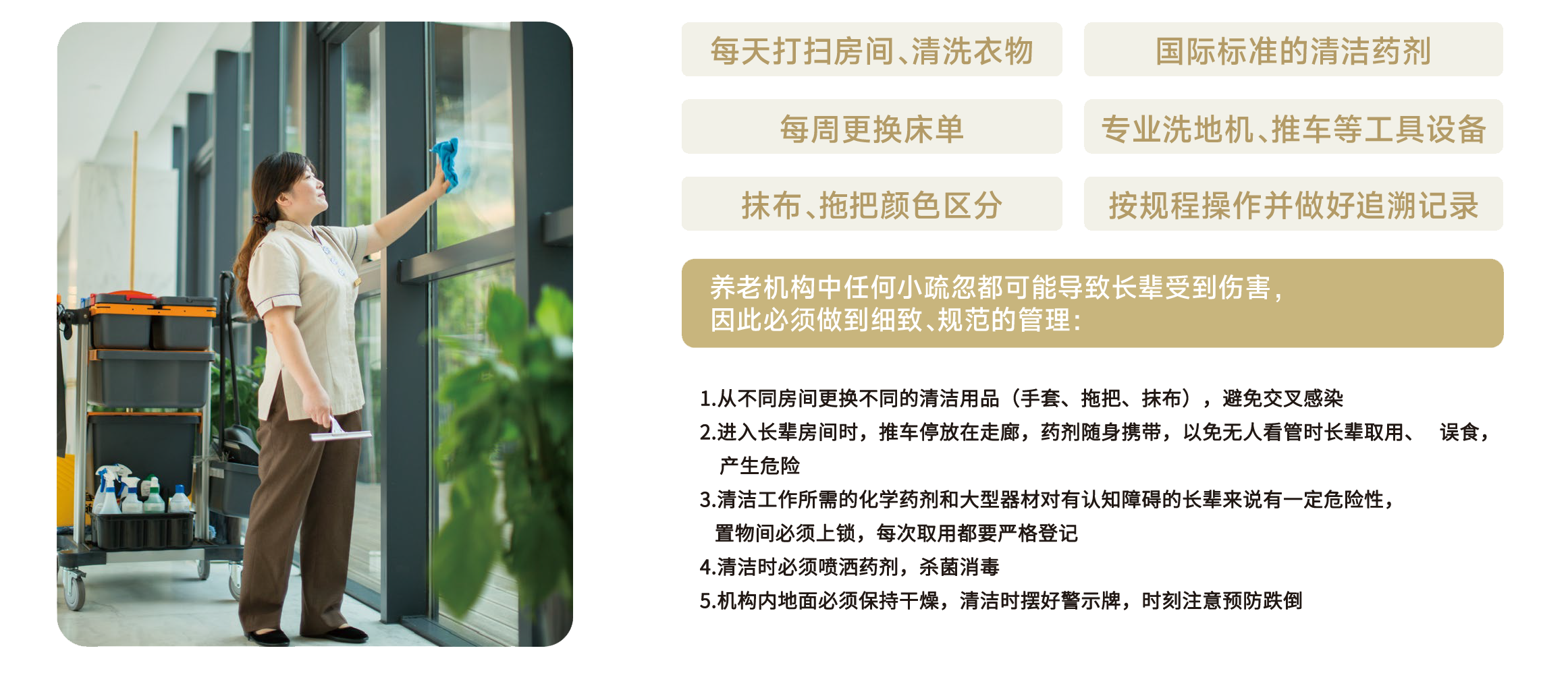 每天打扫房间、清洗衣物 丨 专业洗地机、推车等工具设备 丨 按规程操作并做好追溯记录
