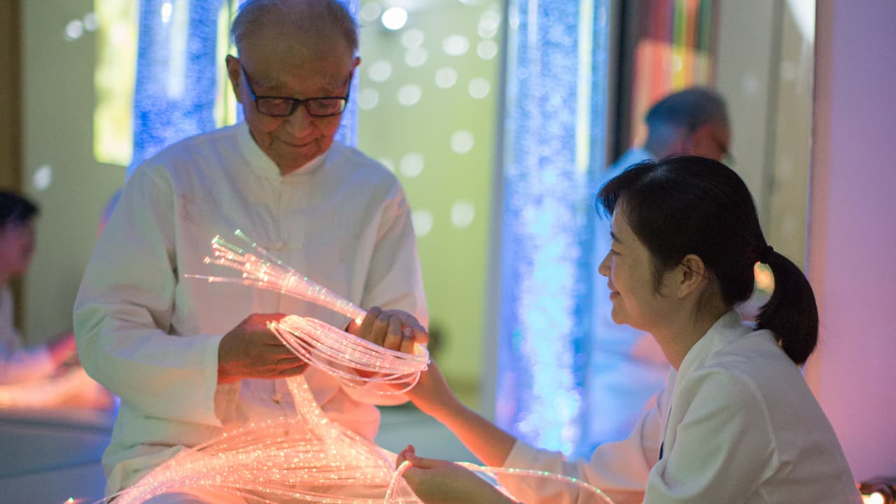 多感官刺激空间内设有多种声影效果及触感材料,主要针对有不同程度认知障碍的长辈,通过专业治疗师的操作,促进个体与外界的接触及交流,锻炼感知能力。